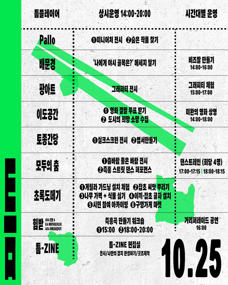 대구를 기반으로 활동하는 미술작가, 거리 예술가, 그래피티 예술가, 댄서, 래퍼, 셀러 등 50여 명이 청년문화의 다양성과 실험정신을 선보인다. 지난 8월부터 진행된 사전 워크숍을 통해 지역 청년들이 직접 기획하고 창작한 ‘거리형 공간실험 콘텐츠’를 시민들과 공유하며, 참여형 프로그램을 통해 도심의 창의적 재활성화와 지역문화의 확산을 이끌 예정이다.