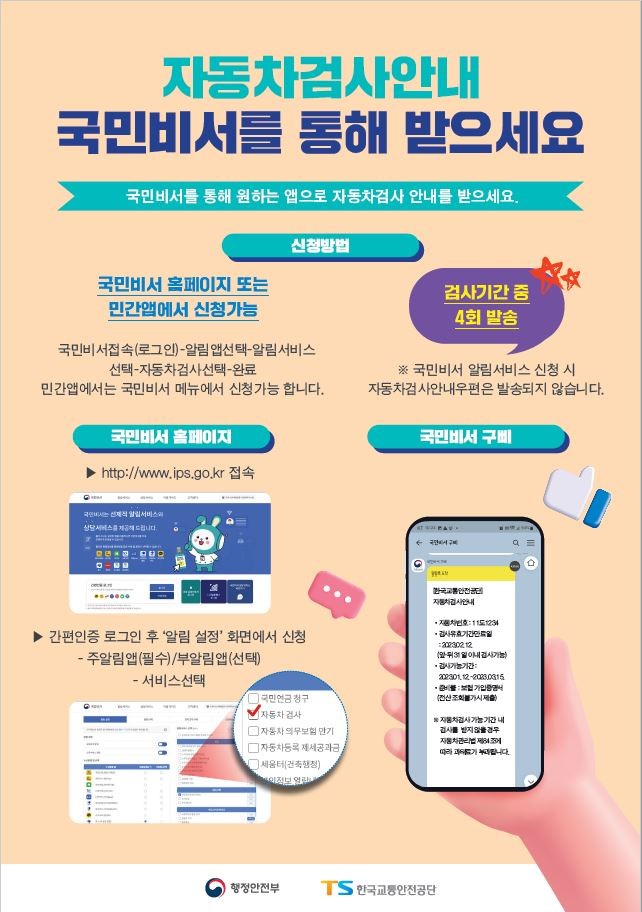 국민비서로 자동차검사의 사전안내 알림을 신청한 차량의 경우 검사기간 동안 총 4회에 걸쳐 안내를 받을 수 있으며,