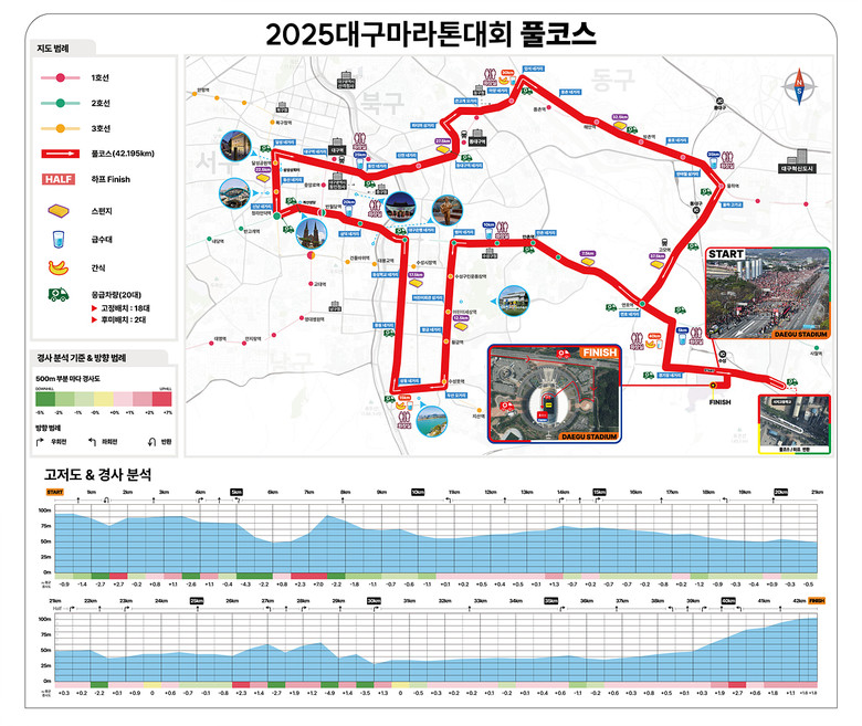세계육상연맹(WA)인증 3년 연속 골드라벨 대회로 선정된 ‘2025대구마라톤대회’에는 4만여 명*이 참가할 예정이며, 경기종목은 엘리트풀, 마스터즈 풀, 하프, 10km 및 건강달리기 5종목으로 구성돼 있다.