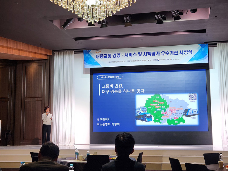 ▸ 비수도권 최초 광역철도 개통 및 수요응답형 교통수단(DRT) 도입 [세계타임즈=대구 한윤석 기자] 대구광역시는 12월 19일(금), 서울 그랜드힐컨벤션에서 열린 ‘2025년도 대중교통 시책평가 시상식’에서 우수 지자체로 선정돼 국토교통부 기관 및 개인 표창을 수상했다.