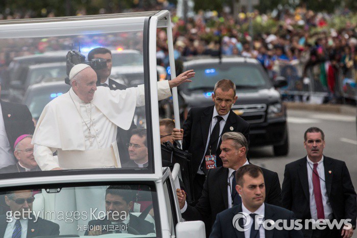| △ (필라델피아/미국=게티/포커스뉴스) 지난 9월27일(현지시간) 미국 필라델피아를 방문한 프란치스코 교황이 야외미사를 집전하러 이동하는 중 그를 보려고 모여든 수천명의 인파에게 손을 흔들며 인사하고 있다. ⓒ게티이미지/멀티비츠 photo@focus.kr |