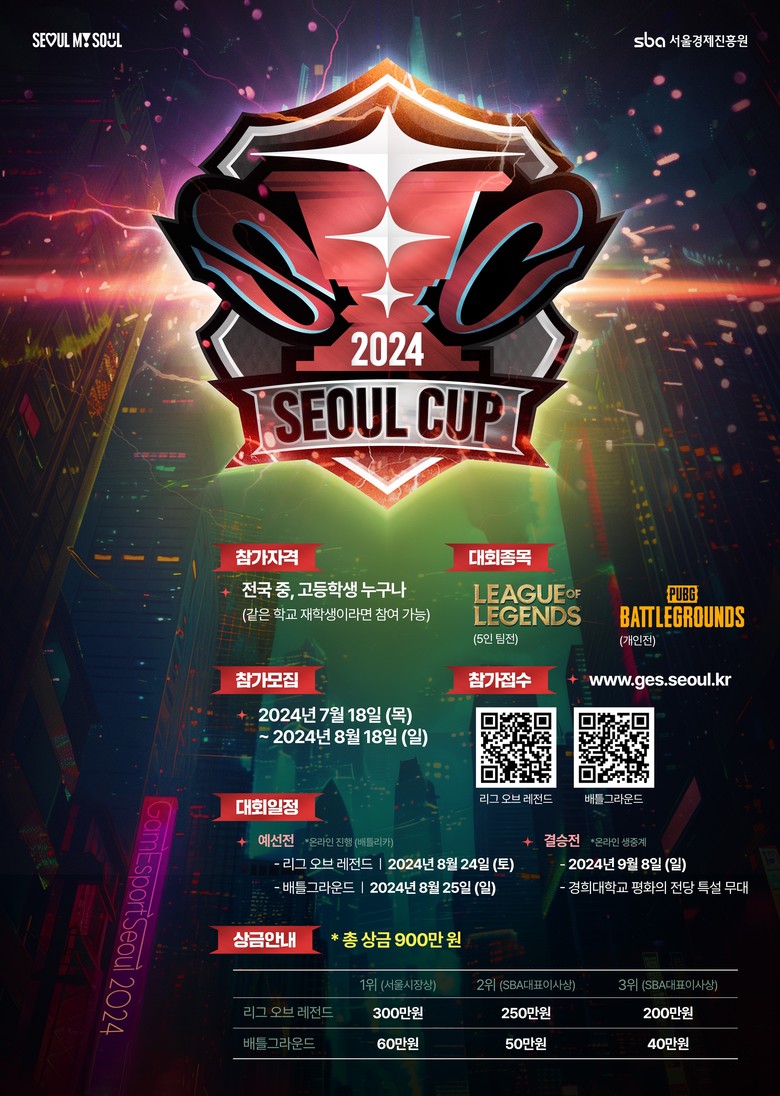 아울러, 3년전부터 전국 중.고등학교 e스포츠 대항전 형태로 치러진 아마추어 e스포츠대회 ‘서울컵’을 개최한다. ‘서울컵’은 인기 게임 리그 오브 레전드(LoL)와 배틀그라운드 2개 종목으로 펼쳐진다.