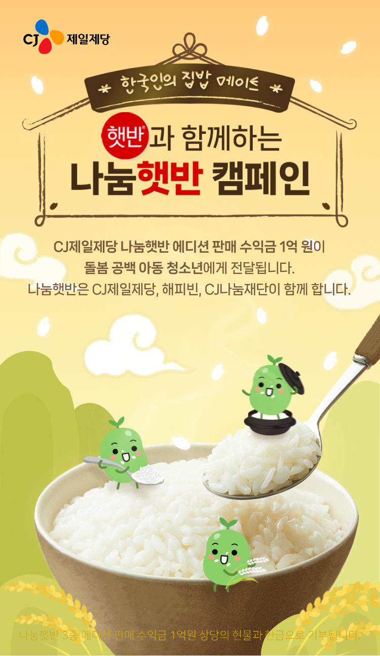 [세계타임즈 = 이현진 기자] CJ제일제당이 네이버 해피빈과 함께 돌봄공백 아동을 지원하기 위한 ‘나눔햇반 캠페인’을 진행한다고 15일 밝혔다.