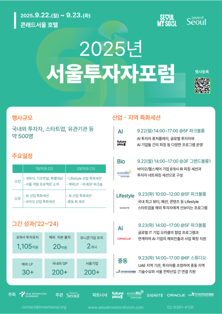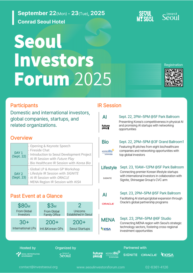 서울시는 9월 22일(월)부터 23일(화)까지 양일간 여의도 콘래드호텔에서 「2025 서울투자자포럼(Seoul Investors Forum, SIF)」을 개최하고, 글로벌 투자자와 서울 혁신기업을 직접 연결하는 맞춤형 투자유치 행사를 진행한다고 밝혔다.