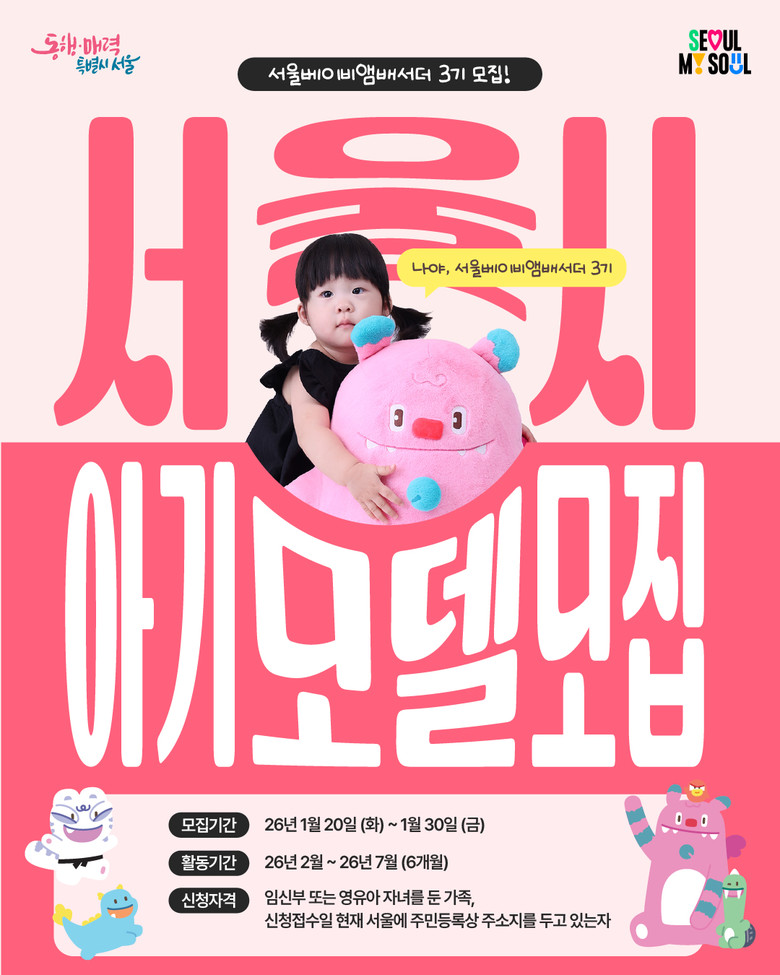 서울시는 ‘서울베이비앰배서더’ 3기 가족을 1월 20일(화)부터 30일(금)까지 11일간 모집한다고 밝혔다.