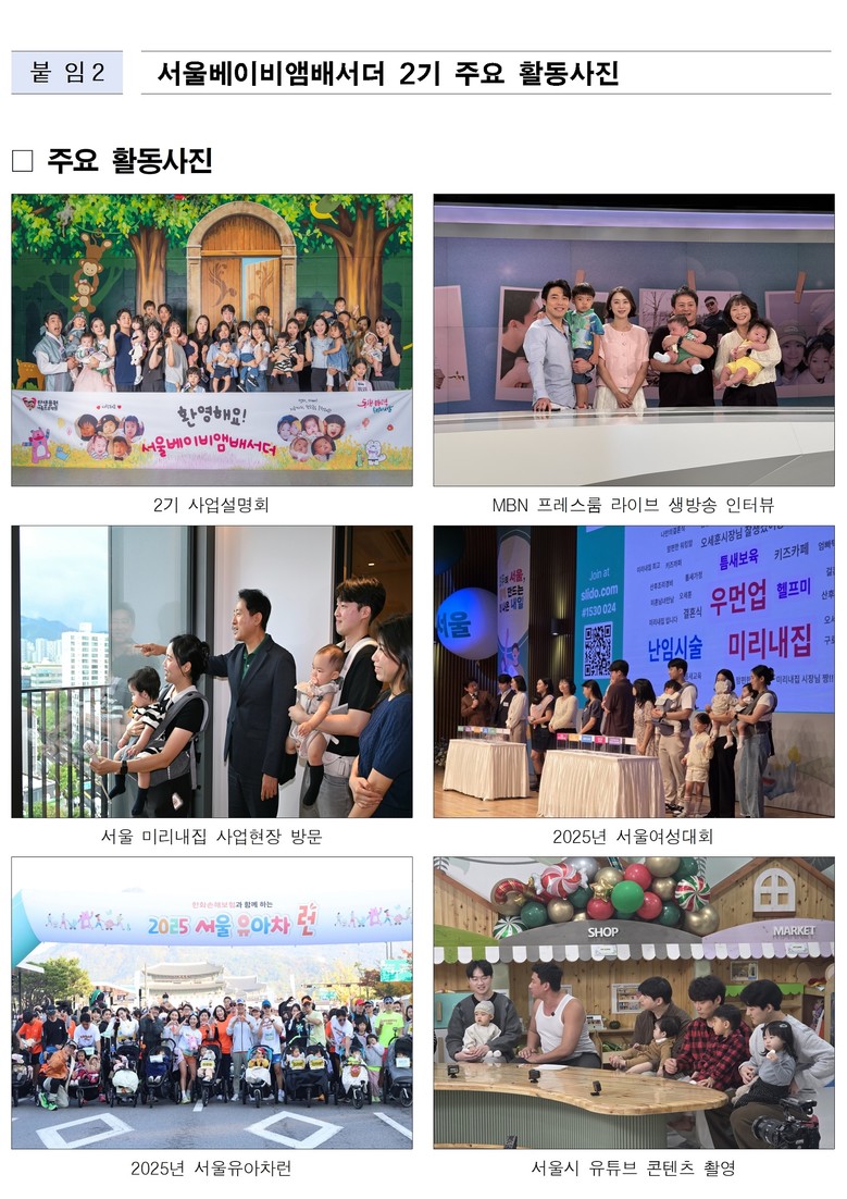이 밖에도 시청사 외벽과 지하철 미디어보드, 역사 내에 게시된 정책 홍보 포스터 제작에도 참여하고, 2025 서울여성대회, 임산부의 날 기념행사, 유아차 런 등 주요 행사에 함께해 육아 가족의 생생한 목소리를 전달해 시민 공감을 이끌어냈다.