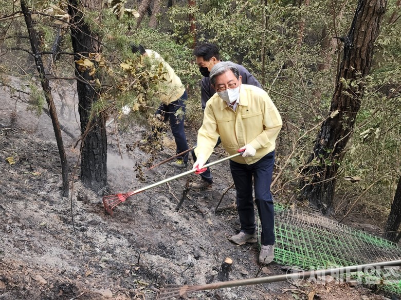 오 후보는 19일 오후 6시경 발생한 대형산불 직후 진화헬기 3대 투입 등 전문진화대원 220여명 등 인력 360여명을 투입하는 비상 상황을 지켜 본 뒤 20일 오전 8시경 잔불 진화 중인 정곡면 죽전리 인근 현장에 투입돼 직접 진화 작업에 나서고 있다.
