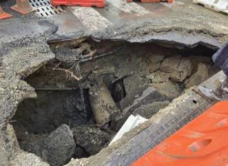 ▲4월 13일 사고지점인 동서고가로 하부에서는 우수박스 측벽을 관통한 폐관다발이 절단된 채 존치돼 있어 관통부를 통해 지속적인 누수가 있었을 것으로 보이며, ▲4월 14일 사고지점인 코콤교차로에서는 소형 땅꺼짐으로 인해 하수관이 내려앉으며 파손돼 누수가 발생한 것으로 판단된다.