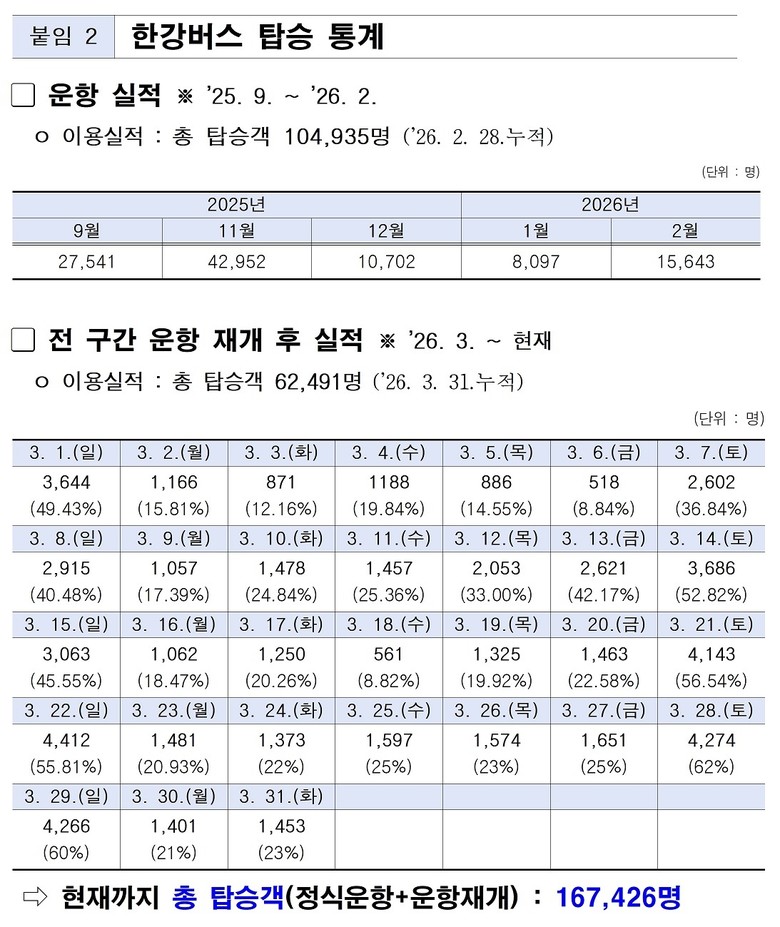 - 부대사업시설도 호황, 시민들이 즐길 수 있는 열린 공간으로 다가갈 예정 [서울 세계타임즈=이장성 기자] 3.1(일) 전 구간 운항 재개 후 순항 중인 한강버스가 3월 한 달 62,491명이 탑승하여 월간 최대 탑승 기록을 경신하였다.