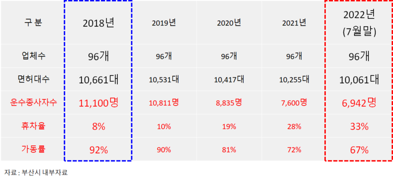 실제 부산시 조사 결과에 따르면, 운수종사원은 매년 감소(2018년 대비 현재 37.5% 감소)하고 있으며, 현재 휴차율은 33%, 가동률은 67% 수준에 그치고 있는 것으로 조사되었다.