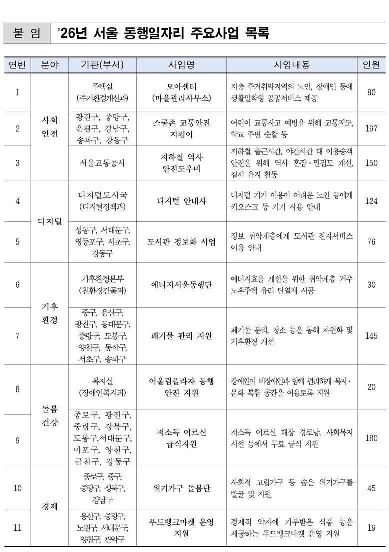 서울시가 이처럼 취업 취약계층이 또 다른 사회적 약자를 돕고 자존감을 회복하는 ‘서울 동행일자리’ 사업을 내년에도 확대 운영한다. 시는 내년도 상반기('26.1.9~6.30.) 동행일자리 사업을 통해 총 6,598명이 사회안전·돌봄건강·디지털·기후환경·경제 등 5개 분야의 729개(시·구 합산) 사업 현장에서 활동할 예정이라고 밝혔다.