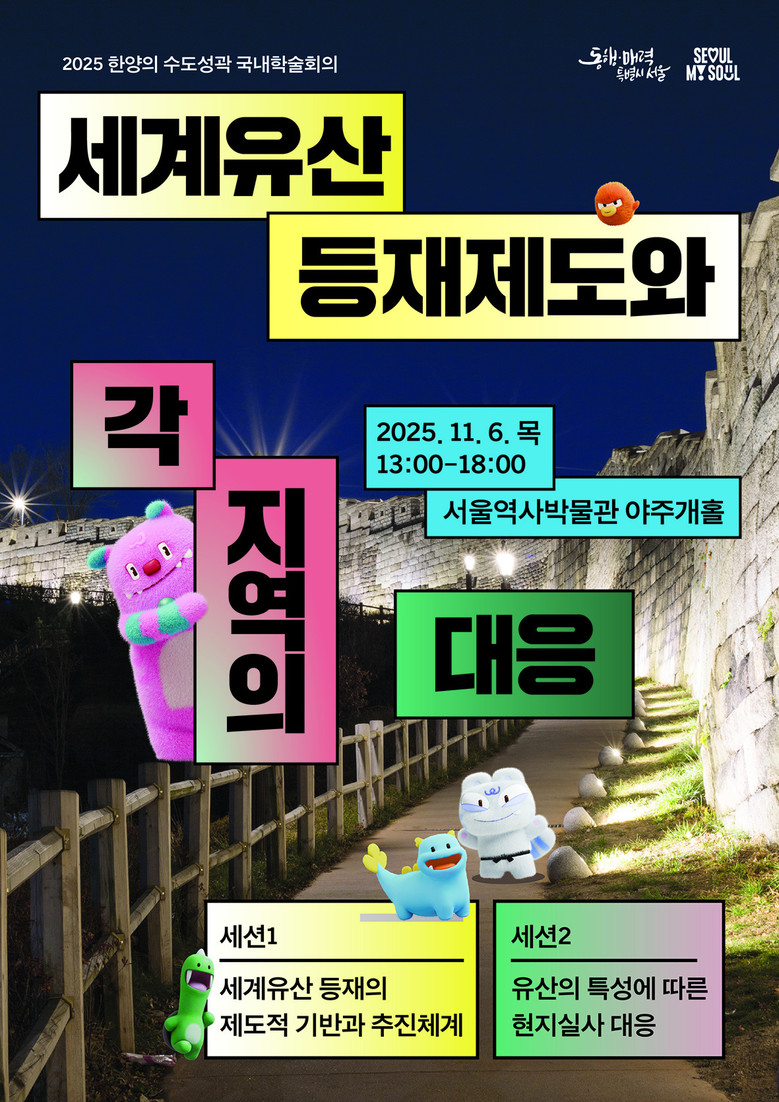 - 관심있는 시민 누구나 무료 참여 가능…현장 만족도 조사 참여자 기념품 제공 [서울 세계타임즈=이장성 기자] 서울시는 11월 6일(목) 오후 1시, 서울역사박물관 야주개홀에서 ‘세계유산 등재제도와 각 지역의 대응’이라는 주제로 <2025년 한양의 수도성곽 학술회의>를 개최한다.