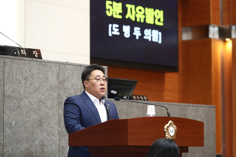 ▲도병두 의원은 대한민국 헌법과 민주이념을 강조하며 5분 발언을 시작했다. 2023년 세수 결손과 지방교부세 삭감으로 지방자치단체들이 어려움을 겪고 있으며, 금천구 역시 지방교부세 삭감으로 피해받고 있다고 지적했다. 이어 금천구의 발전과 구민 복지 증진을 위해 금천구의회와 구청이 적극적으로 협력해야 하며, 공직자들의 노고에 감사의 뜻을 전했다.