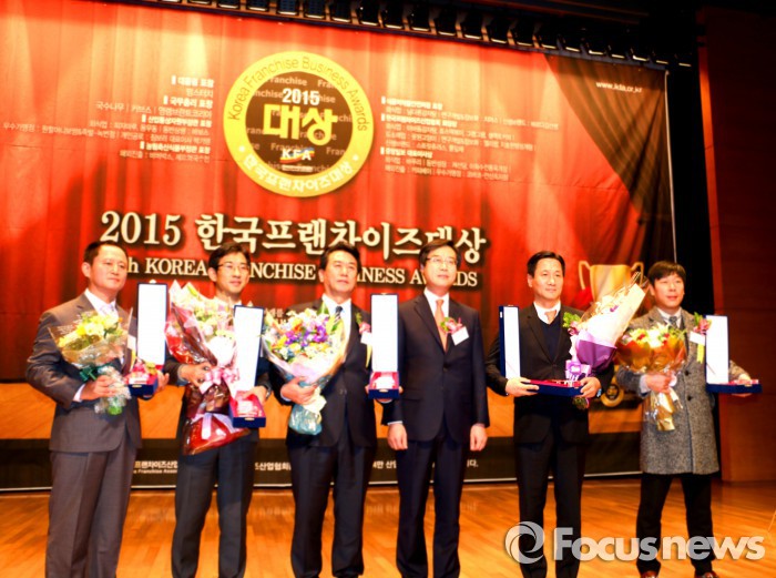 | △ 김익수 채선당 대표(오른쪽에서 두 번째)가 3일 서울 대한상공회의소에서 열린 '제16회 한국프랜차이즈대상' 시상식에서 수상 후 기념촬영을 하고 있다. <사진제공=채선당> |