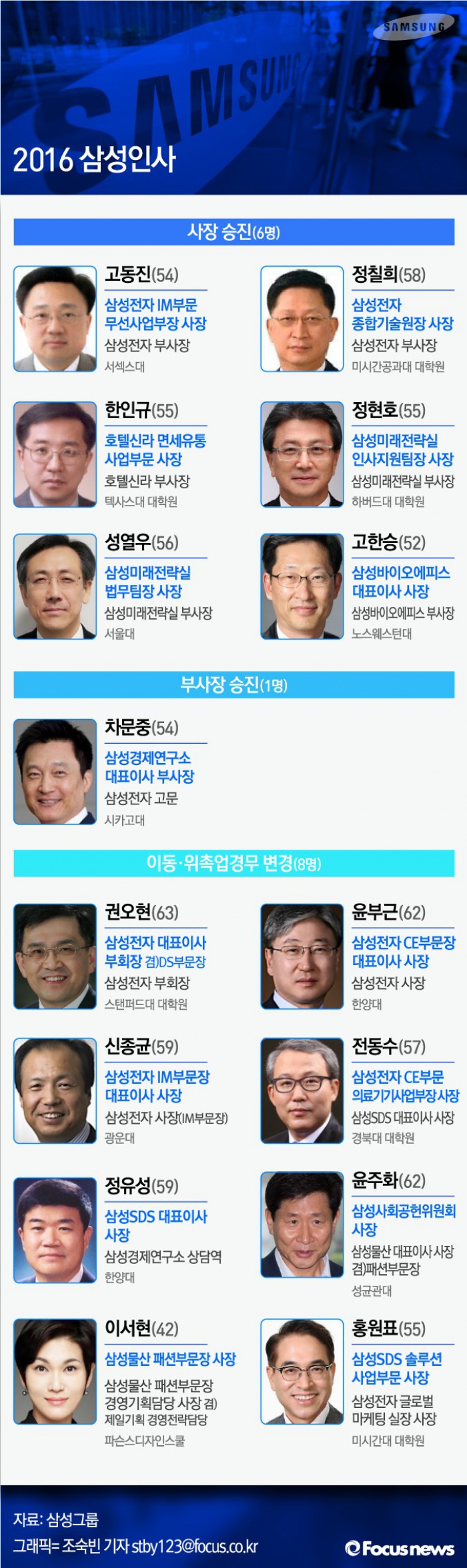| △ 삼성그룹은 1일 사장 승진 6명, 대표 부사장 승진 1명, 이동·위촉업무 변경 8명 등 총 15명 규모의 2016년 정기 사장단 인사를 단행했다. <그래픽 제공=포커스뉴스> |