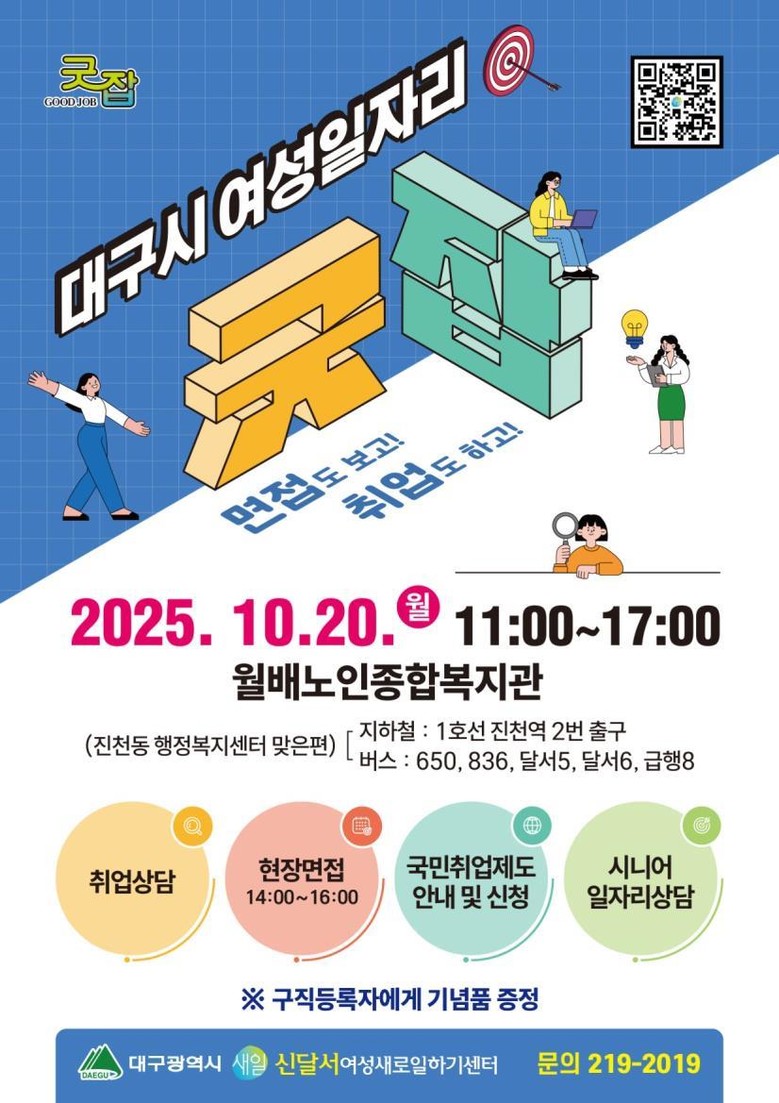 ▸ 현장면접 1개 업체, 간접채용 9개 업체… 총 12여 명 채용 예정 [세계타임즈=대구 한윤석 기자] 대구광역시는 취업을 희망하는 경력단절 및 미취업 여성을 위해 10월 20일(월) 오전 11시부터 오후 5시까지 월배노인종합복지관(달서구 진천동)에서 ‘찾아가는 여성일자리 굿잡(Good Job)’ 행사를 운영한다.