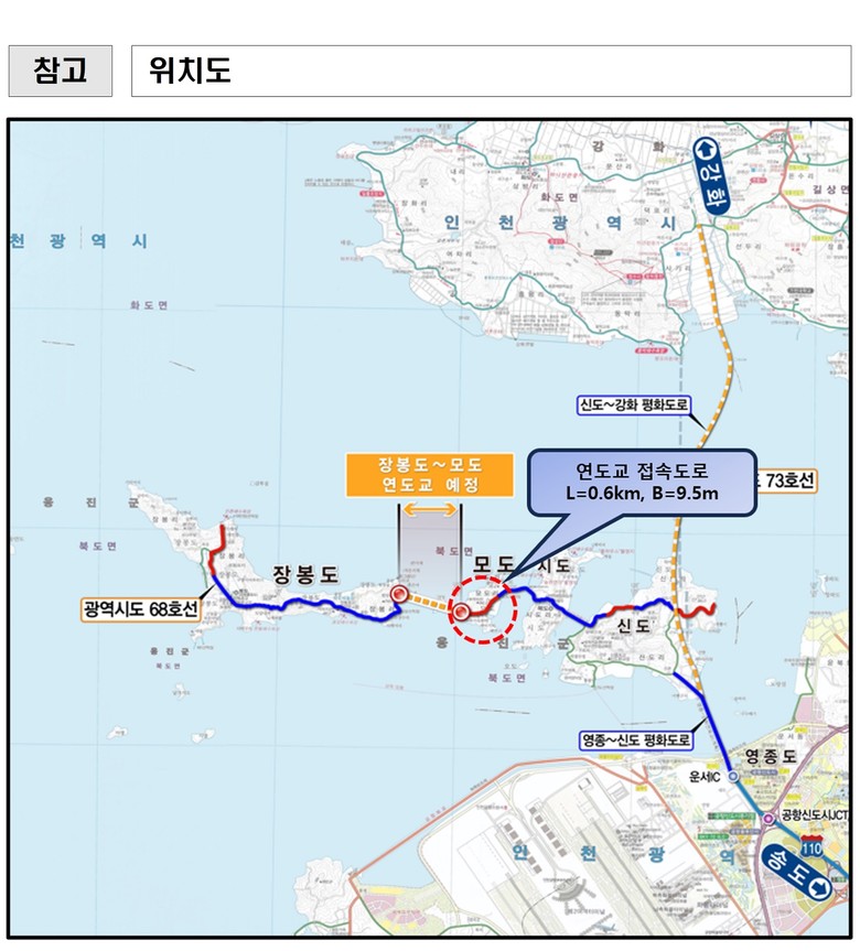 이번 공고 대상은 2023년 5월 1일 광역시도로 승격된 옹진군 북도면 장봉도와 모도·시도·신도를 연결하는 총 15.9km 구간 중, 모도리 일원 0.6km 구간(폭 9.5m, 왕복 2차로)으로 계획됐다. 해당 구간은 향후 연도교 진입도로 역할을 수행하게 될 핵심 구간이다.