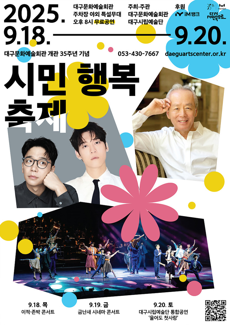 축제의 마지막 날에는 대구시립예술단이 함께하는 음악극 ‘울어도 첫사랑’을 선보인다. 대구시립국악단, 시립극단, 시립무용단, 시립소년소녀합창단 등 여러 예술단이 함께 참여하는 이번 공연은 지역 예술단이 협업하는 통합공연 형식으로, 다양한 장르가 한 무대에서 어우러지는 종합예술의 형태를 선보인다.