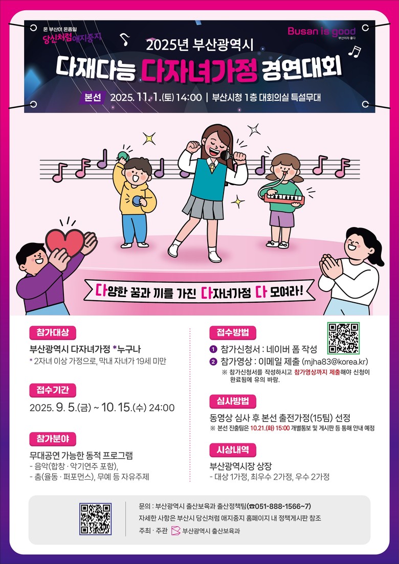 형제자매간 호흡과 배려를 바탕으로 에너지가 넘치는 무대를 선보인 가정을 우선 선발하며, 부산시에 주민등록을 두고 있는 다자녀가정이면 누구나 참여할 수 있다.