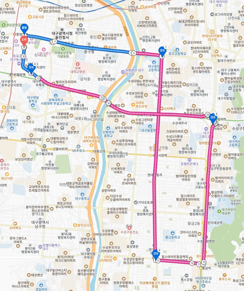 ▸코스 : 동성로28아트스퀘어 → CGV대구한일 → 종각네거리 → 청구네거리 → 들안길네거리 → 황금네거리 → 대구어린이대공원(휴식) → 범어네거리 → 수성교 → 통신골목 → 시계탑 → 동성로28아트스퀘어