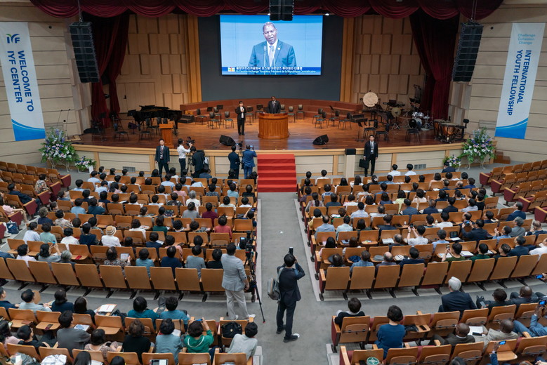 (5일, IYF 센터를 방문한 포스텡 아르샹주 투아데라 중아공 대통령이 IYF 대강당에서 연설을 하고 있다. 사진=IYF)