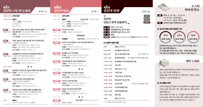 그 밖에도 강원학 포스터 발표와 지역 도서전 등 다양한 행사도 진행될 예정이다. 강원학 성과의 향유를 위한 강원학 주간 행사에 많은 참여와 관심을 바란다.