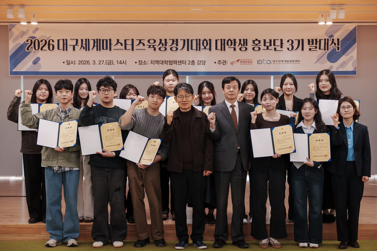 ▸ 대회 전 마지막 기수… 붐업 및 지속가능한 스포츠 가치 확산 주도 [세계타임즈=대구 한윤석 기자] 2026대구세계마스터즈육상경기대회 조직위원회(이하 조직위)와 대구국제개발협력센터는 3월 27일(금) 지역대학협력센터에서 ‘대학생 홍보단 3기 발대식’을 열고, 대회의 성공적인 개최를 위한 청년 홍보활동의 시작을 알렸다.