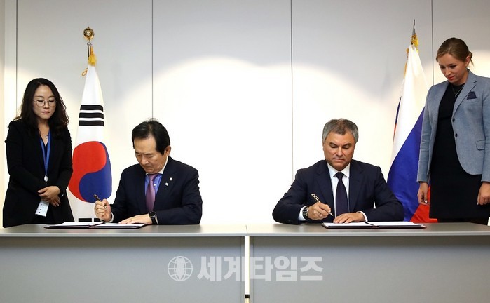 [세계타임즈 이채봉 기자]러시아를 공식 순방 중인 정세균 국회의장이 뱌체슬라프 빅토로비치 볼로딘 (Vyacheslav Viktorovich VOLODIN) 러시아 하원의장과 현지시간 10월 14일(토) 오후 양국간 의회협력 발전에 관한 폭넓은 양자 및 국제 현안 논의를 위한 공동성명을 발표했다.
