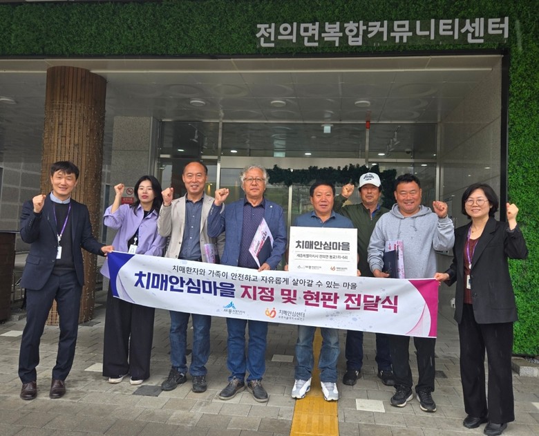 세종특별자치시보건소 치매안심센터장은 22일 전의면 행복누림터에서 치매안심마을 지정현판을 전달하고, 운영위원 6명에게 위촉장을 수여했다.