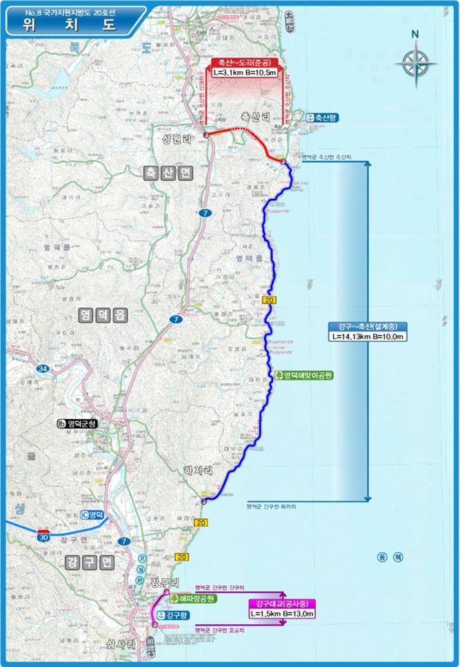 국토부가 설계 중인 하저리에서 경정리 구간 강구~축산 국지도 20호선 건설공사 실시설계 용역이 마무리되면 조속히 착공할 계획이다.