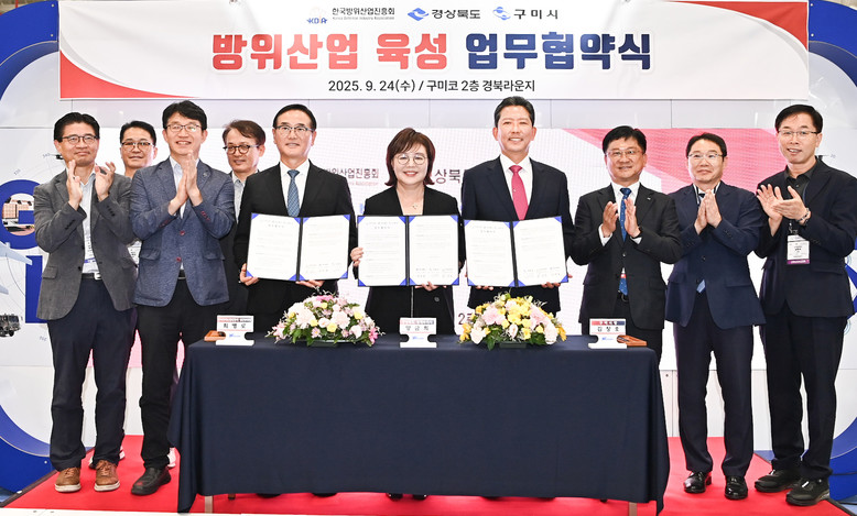 - 한국방위산업진흥회-경상북도-구미시 업무협약 체결 - [세계타임즈=경북 한윤석 기자] 경상북도는 한국방위산업진흥회, 구미시와 24일 구미코에서, 기관 간 방위산업 전문인력양성, 정보교류 등 다양한 분야 협력을 위한 업무협약을 체결했다.