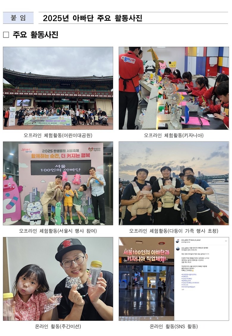이와 더불어 시는 ‘서울 200인의 아빠단’ 외에도, 아빠들이 육아 과정에서 겪는 어려움을 줄이고 실질적인 도움을 받을 수 있도록 다양한 지원사업을 추진한다.