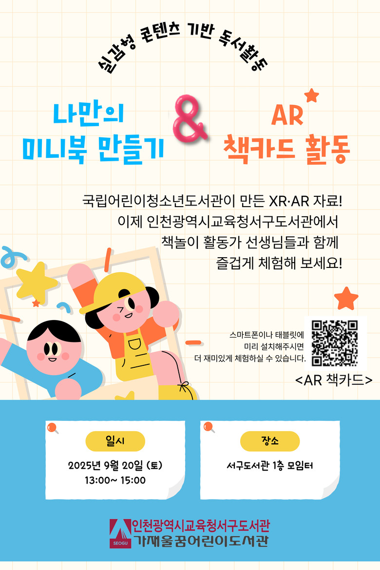 이번 프로그램은 국립어린이청소년도서관에서 제작한 AR(증강현실) 책카드와 미니북 자료를 활용한 체험형 독서활동으로, 참가 어린이는 태블릿PC나 스마트폰을 이용해 동화 속 장면을 AR로 체험하고, 동화 내용을 바탕으로 미니북 제작과 독서 활동을 진행한다.