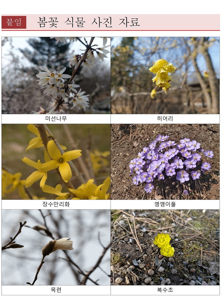 ▸ 미선나무, 히어리, 장수만리화, 깽깽이풀, 목련, 복수초, 영춘화, 산수유, 개나리, 진달래