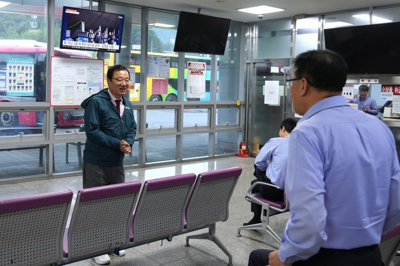 | ▲추석을 하루 앞둔 5일, 이현재 하남시장이 창우동 BRT 환승센터에 방문해 운수 종사자들을 격려를 하고 있다.(사진=하남시) |