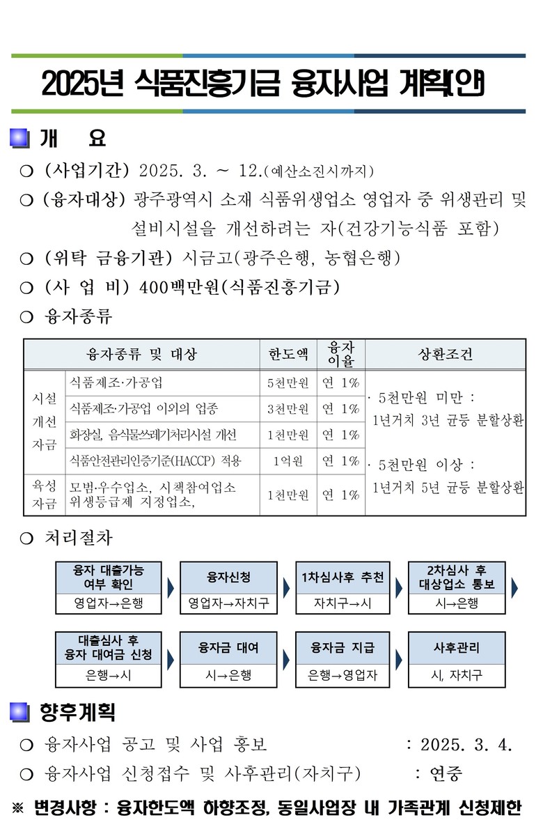 지원 대상은 융자신청일 기준 광주시에서 식품위생법에 의한 영업 신고(허가·등록)를 하고 있는 자로서 위생관리 시설을 개선·확충하려는 식품접객업소, 식품제조·가공업소 등이다.