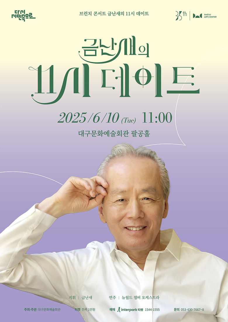 김희철 대구문화예술회관장은 “‘금난새의 11시 데이트’는 여유로운 오전 시간, 감미로운 클래식으로 삶의 여백을 채우는 공연으로 자리매김하고 있다”며, “앞으로도 이 마티네 콘서트 시리즈가 계절의 감성과 클래식의 아름다움을 전하는 소중한 무대로 이어지길 희망한다.”고 말했다.