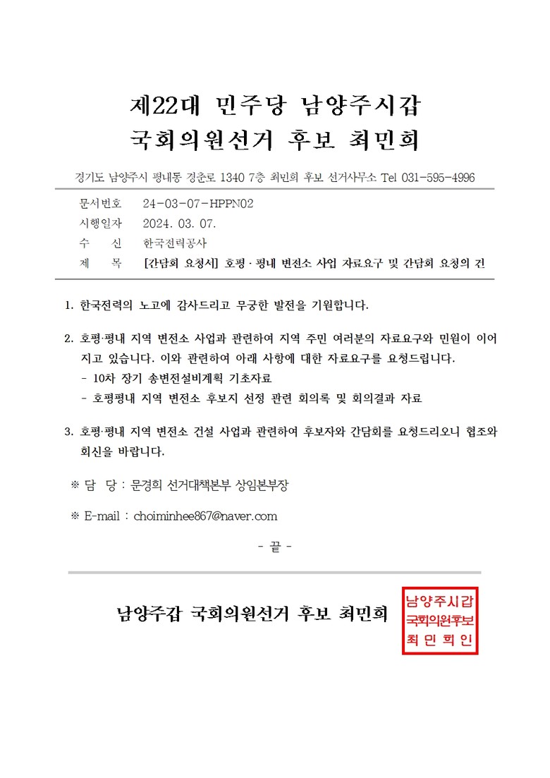 최 후보 선거사무소는 오늘(8일) 호평·평내 지역 변전소·송전탑 건설사업의 원점재검토를 촉구하며 후보지 선정에 관한 회의내용과 관련 기초자료를 공식 요구했다고 밝혔다.