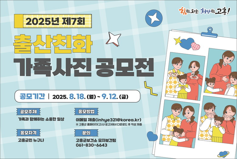 이번 공모전 주제는 ‘가족과 함께하는 소중한 일상’으로 ▲임신·출산·육아의 행복과 소중함 ▲다자녀·다문화·다세대 가정 및 공동육아 모습 ▲고흥에서 부부가 함께 육아하고 성장하는 이야기 ▲고흥군 관광명소(고흥 10경 등)를 배경으로 촬영한 단란한 사진 등 1년 이내 촬영한 사진이면 참여할 수 있다.