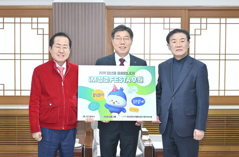 ○ 장 소 : 대구광역시 산격청사 접견실 [세계타임즈=대구 한윤석 기자] DGB금융그룹(회장 황병우)은 지역청년의 다양한 공연과 활동을 지원하기 위해 홍준표 대구광역시장, 황병우DGB금융그룹회장, 배기철 대구광역시행복진흥사회서비스원장이 참석한 가운데 ‘iM 청춘 페스타’ 후원금으로 1억 원을 전달했다.