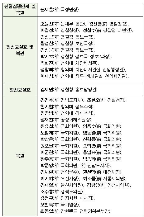 김 전 지사는 친문재인계 적자이자 더불어민주당 이재명 전 대표의 잠재적인 경쟁자로 꼽히는 만큼 복권으로 정치 조기 복귀 여건이 조성되면 상당한 정치적 파장이 일 것이란 관측이 나온다.정부에 비판적인 단체나 예술가를 정부 지원 대상에서 배제하는 이른바 문화계 블랙리스트 사건으로 징역 1년 2개월을 확정받아 복역한 조윤선 전 정무수석도 이번 사면·복권 대상에 포함됐다.보수단체를 불법 지원했다는 이른바 화이트리스트 사건으로 복역한 현기환 전 정무수석, 대기업에 거액의 미르재단·K스포츠재단 출연금을 압박한 혐의로 징역형을 선고받은 뒤 만기 출소한 안종범 전 정책조정수석도 복권됐다.국정원 예산으로 민간인 댓글 부대를 운영하는 등 재직시절 각종 정치 공작을 벌인 혐의로 복역하다 지난해 가석방된 원세훈 전 국정원장도 사면 및 복권됐다.박근혜 정부 때 총선에 개입한 혐의로 유죄를 확정받은 강신명·이철성 전 경찰청장, 이명박 정부 시절 댓글 여론 공작에 관여한 혐의로 유죄를 확정받은 조현오 전 경찰청장과 경찰청 정보·보안국장 등 고위 간부들도 대거 복권 명단에 이름을 올렸다.전직 국회의원 가운데 원유철·엄용수·노철래·염동열·박상은·신학용·권오을·송희경·이군현·홍일표·황주홍·박종희·박준영 전 의원 등 13명도 복권됐다.정재찬 전 공정거래위원장, 권선택 전 대전시장, 이기하 전 오산시장, 김시환 전 청양군수, 유영구 전 명지학원 이사장, 최동열 전 강원랜드 전략기획본부장 등도 복권됐다.경제인 가운데서는 미공개 정보를 통해 차명 계좌로 주식을 샀다가 파는 방식으로 11억여원의 시세차익을 올린 혐의로 지난해 8월 징역 2년형을 확정받은 이동채 전 에코프로 그룹 대표가 사면됐다.정원주 중흥그룹 부회장과 조순구 전 인터엠 대표, 최규옥 전 오스템임플란트 회장도 복권됐다.정부는 여객·화물 운송업, 생계형 어업, 운전면허 등 행정제재 대상자 총 41만7천260명에 대한 특별감면 조치를 실시하기로 했다.사면 효력은 15일 오전 0시부터 발생한다.