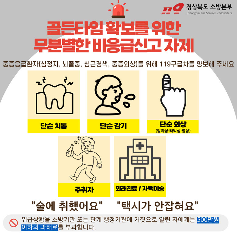 또한 경미한 질환, 단순 통증, 주취자 귀가 지원 등은 119구급출동 대상에 해당하지 않으며, 이러한 신고가 지속될 경우 중증 응급환자에게 배정되어야 할 구급차가 적시에 도착하지 못하는 문제가 발생할 수 있다고 밝혔다.