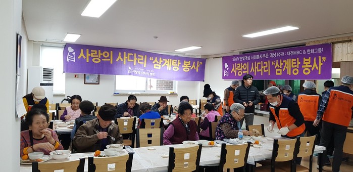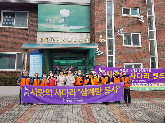[대전=세계타임즈 이채봉 기자] 대전시 SNS 8천명 봉사단체 사랑의 사다리 밴드(리더 이정제)는 3일 오전11시, 법동종합사회복지관(관장 박명순)에서 삼계탕봉사로 사회적 효행을 실천 하였다.
