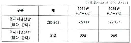 또한 서울지하철의 냉방 민원은 2022년도 18만 1,048건에서 2024년 29만 9,709건으로 약 66%가 증가하였으며, 올해 6월 1일부터 7월 8일 현재 144,649건의 민원이 발생해 전년 동기 140,656건보다 약 3% 상승하였다.