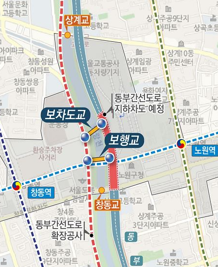 창동‧상계 동서 간 연결하는 보차도교는 폭 32m, 연장 132m, 보행교는 폭 10m, 연장 115m 규모로 2017년 9월 기본계획 수립하고 2021년 4월에 착공했다.