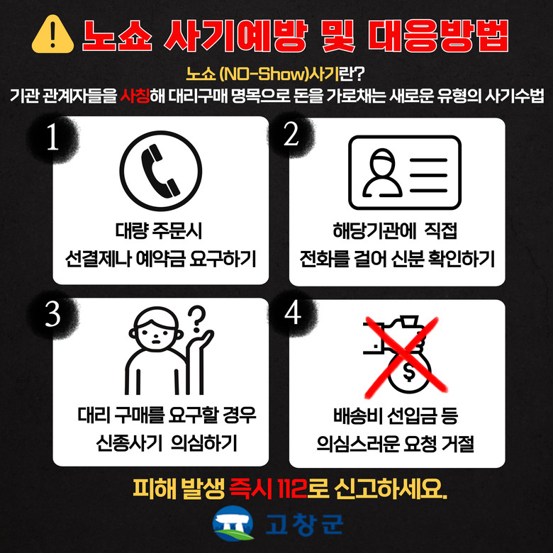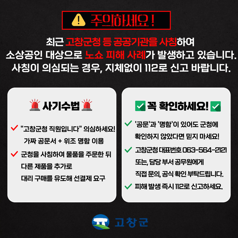 황민안 고창군 신활력경제정책관은 “군청에서 진행하는 모든 공식 업무는 반드시 대표전화나 부서 직원을 통해 확인해 주길 바란다”며 “고창군청 이름으로 의심스러운 공문이나 신분증을 받았을 경우 즉시 군청에 문의해 피해를 사전에 차단해 달라”고 말했다.