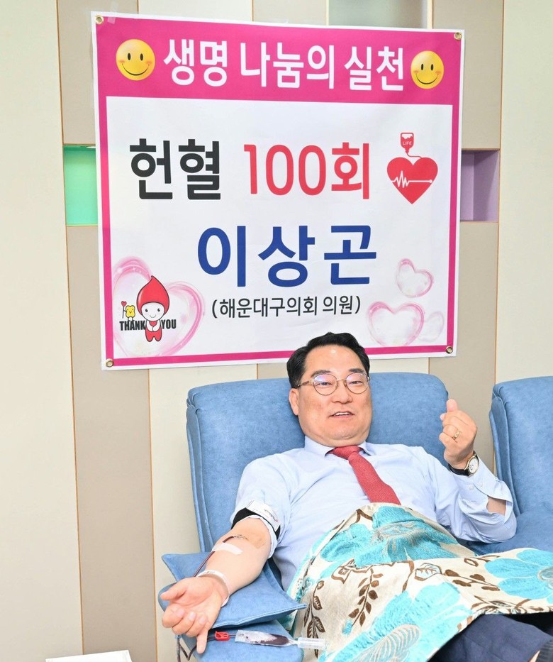 [세계타임즈 백진욱 기자] 부산시 해운대구의회 이상곤 의원이 이번 세계 헌혈자의 날을 기념하여 헌혈 100회를 달성, 명예장 헌혈 유공패를 받았다.