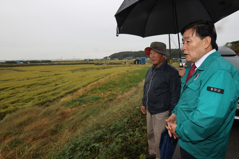 옹진군수는 연휴가 끝난 10일 즉시 북도·영흥면 현장을 찾아 벼 도복 상태를 점검하고, 수확을 앞둔 벼가 넘어지면서 수확량 감소와 품질 저하 우려에 근심이 큰 농민들을 위로했다.