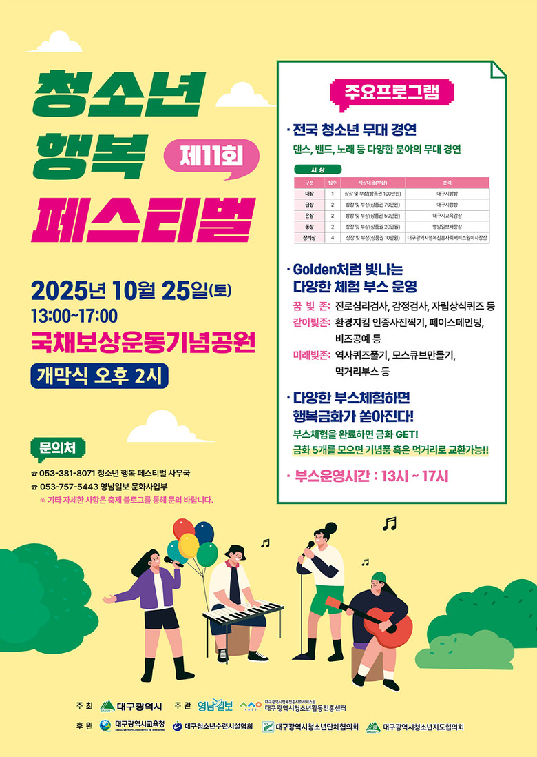 [세계타임즈=대구 한윤석 기자] 대구광역시는 10월 25일(토) 오후 2시, 국채보상운동기념공원에서 ‘2025년 제11회 청소년 행복 페스티벌’을 개최한다.