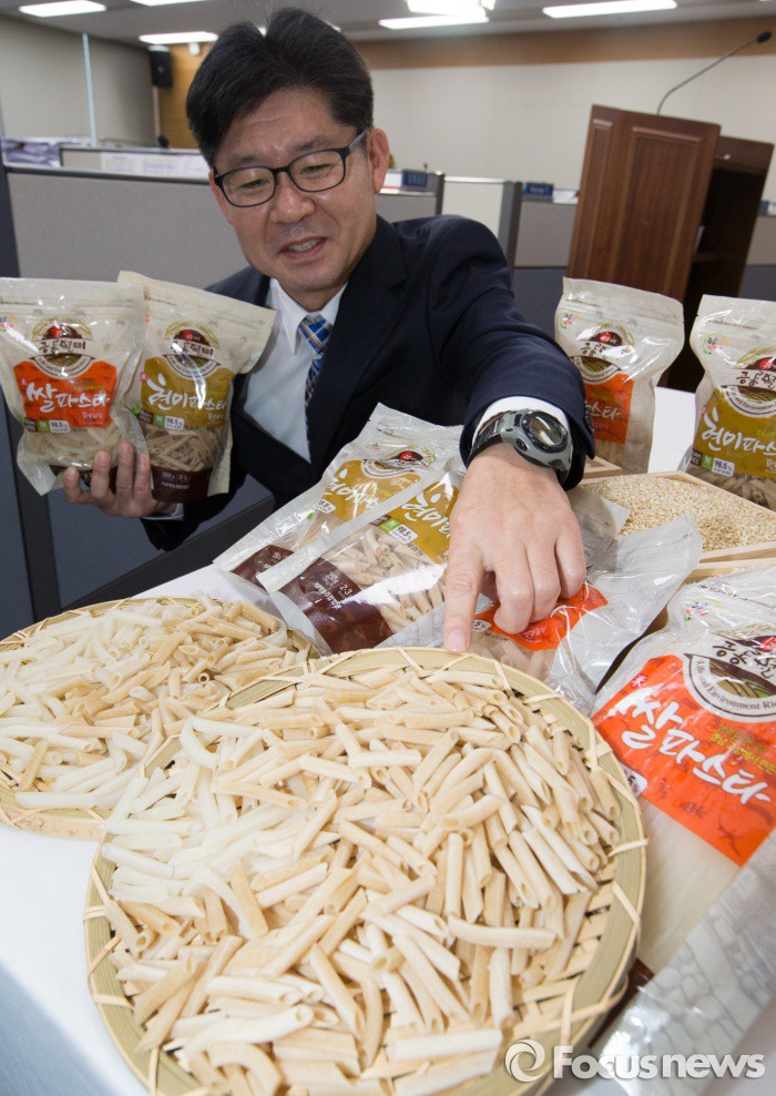 (세종=포커스뉴스) 18일 오전 세종시 정부세종청사 농림축산식품부에서 이영희 국립식량과학원 남부작물부장이 쌀 파스타 만들기 좋은 벼 새미면을 육성, 이를 이용한 파스타 제조기술 개발 관련 브리핑을 마치고 제품을 설명하고 있다.
